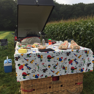 Die Wetterlage war jedoch dann schwierig, so dass wir nur das Untergerät getestet haben und danach das mitgebrachte Frühstück zubereiteten. Unser neuer Ballon wurde nämlich ausgestattet mit Frühstückstisch und Picknickkorb geliefert. So haben wir ein tolles Frühstück zubereitet und mit unserer lieben Mannschaft 4 Stunden tolle Zeit verbracht. Und wir können festhalten - der Brenner funktioniert zumindest schon mal zum Rührei zubereiten!